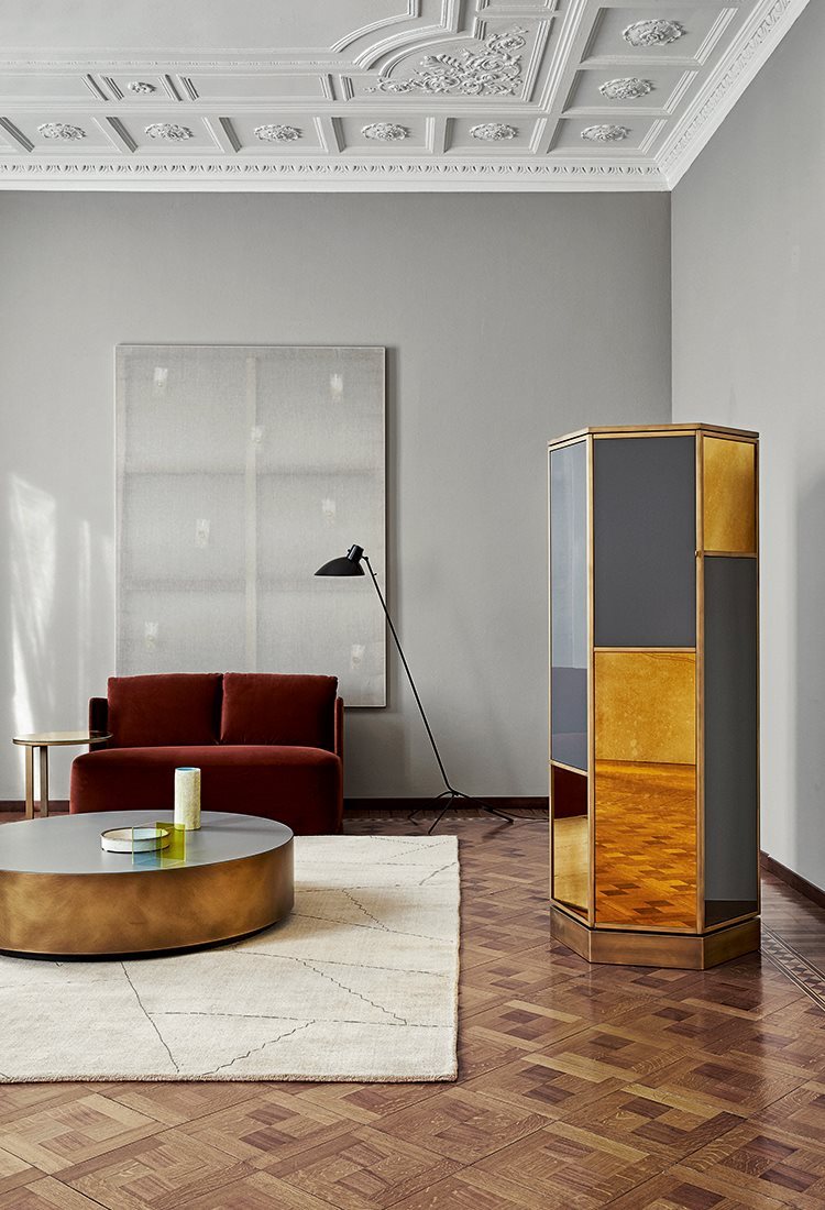 Ludwig. Sześciokątna, wysoka szafka przywodząca na myśl smukłą kolumnę. Drewniana rama uzupełniona jest wstawkami z brązowanego mosiądzu. Fronty największe wrażenie robią, gdy poukłada się je z rozmaitych materiałów i kolorów, które uwypuklają wówczas jej geometryczność. Na przykład fazowane lustra i ciemny matowy lakier. Albo Ludwig Diamond, którego fronty wykonane są wyłącznie z fazowanego, brązowionego lustra z efektem postarzonego złota. Klejnot w salonie.